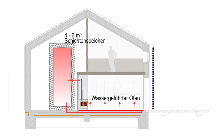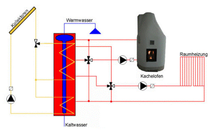 Die Nachheizung des Pufferspeichers erfolgt ebenfalls regenerativ, zum Beispiel durch einen wohnraumbeheizten Holzofen mit Wassereinsatz.
