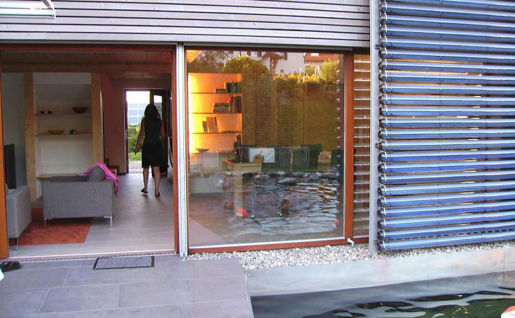 Es wird also mehr Strom produziert, als eine durchschnittliche Familie im Jahr verbrauchen würde. Zusätzlich sind für die Warmwassererzeugung Vakuumröhren an der Südfassade installiert.