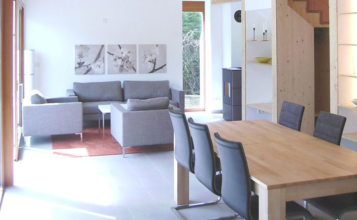 Das Innere des Sonnenhauses wird hauptsächlich über den Fußboden erwärmt. Durch die niedrige Vorlauftemperatur (30-35°C) kann die Wärmeschichtung